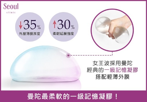 “女王波”是由曼陀Mentor公司新推出的光滑面果凍矽膠植體,“光滑面植體”一直以來都比“絨毛面植體”來的柔軟,加上女王波的外膜厚度比起傳統植體減少35%, 就像較輕薄的外衣,擁有較高的柔軟度,女王波柔軟度因此也得到30%的提升!