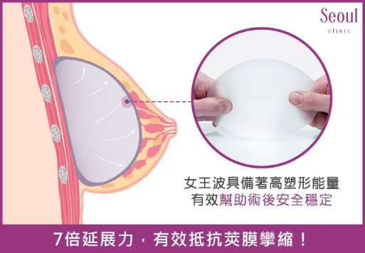 女王波的外膜擁有“三層矽膠外膜”,經測試擁有高達7倍的延長力,即使受到強力撞擊也能迅速恢復。強韌的外膜加上高塑形能量,經過長達10年統計,女王波發生「莢膜攣縮」的機率小於1%。能有效抵抗莢膜攣縮,穩定自然的支撐整體胸型,可以說的是相當安全!