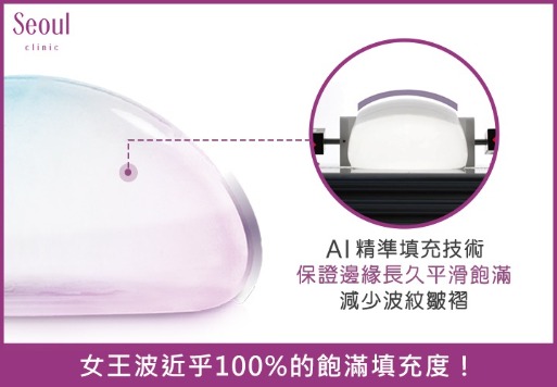 女王波的填充率落在95%~99%之間的浮動值, 採用Ai精準填充技術,每一種尺寸的女王波擁有相對應的植體填充率,在追求完整填充的飽滿度之餘也預留了部分空間,滿足觸覺上的自然手感!
