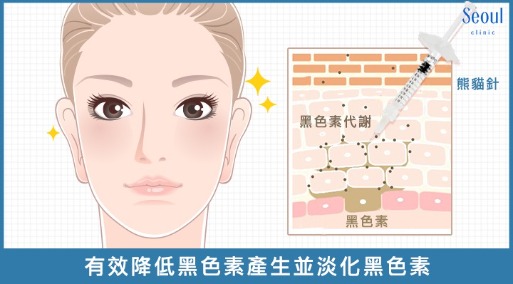 膠原蛋白熊貓針(俗稱熊貓針、稚齡針)成分為第I型atelocollagen,植入後分散的膠原蛋白會形成一個柔軟且具黏性的纖維狀結構,能有效達到固定,支撐性佳且不易位移。膠原蛋白降解後產生的胺基酸除了可以提供肌膚養分,更能有效降低黑色素產生並淡化黑色素。