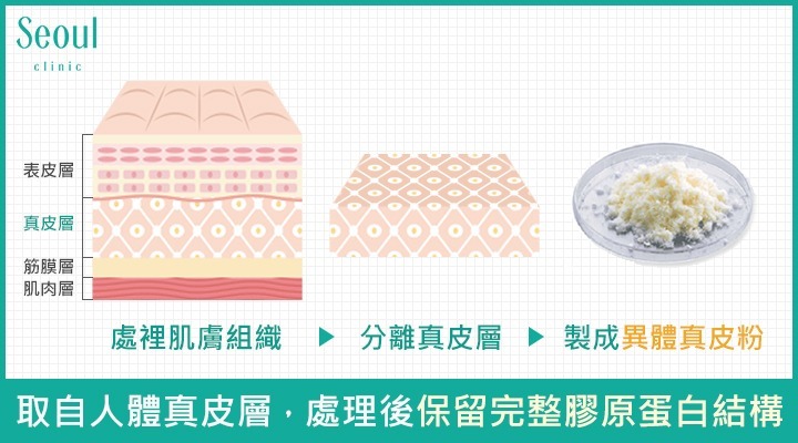 異體真皮是取自人體的真皮層,真皮組織位於表皮與皮下組織之間,具有非常好的彈性及柔軟度,也是皮膚結構中最厚的部分。真皮層組織經『AlloClean™脫細胞工程』去除細胞及免疫排異因子,保留完整膠原蛋白及彈性蛋白結構,就成為適合人體可以使用的醫療材料,例如:燒燙傷的自體皮膚移植替代品。而微整所使用的異體真皮「粉」,顧名思義,就是將片狀的「異體真皮」特殊處理成粉狀型態的「異體真皮粉」,再裝至針筒內、以便醫師注射在需要施打、填植的部位上。