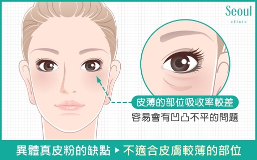 因皮薄的部位吸收率較差,容易會有凹凸不平的問題,例如:淚溝、眼窩等部位。