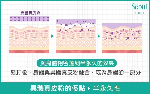 施打異體真皮粉後,可與身體組織相容,達到半永久的效果。