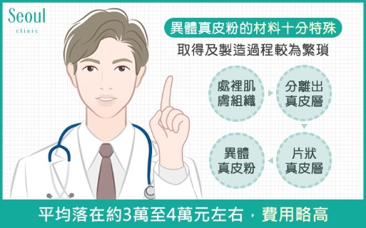 因異體真皮粉的材料十分特殊,取得及製造過程也較為繁瑣,所以費用較高。