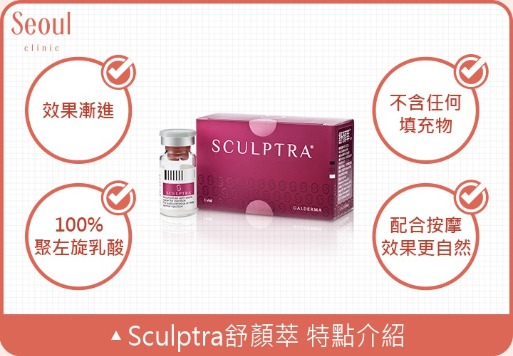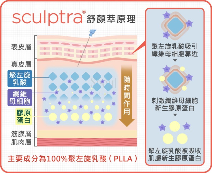 Sculptra舒顏萃(俗稱童顏針)主要成份為3D聚左旋乳酸 (PLLA),是能與生物相容且能被生物降解、在醫學界使用超過30年、十分安全的物質。Sculptra舒顏萃注入真皮層後,會以漸進的方式刺激纖維母細胞及彈性纖維,使其再生製造膠原蛋白,逐漸修復凹陷、下垂、細紋等問題,並且隨著時間愈來愈明顯,使肌膚恢復豐潤、彈性。
