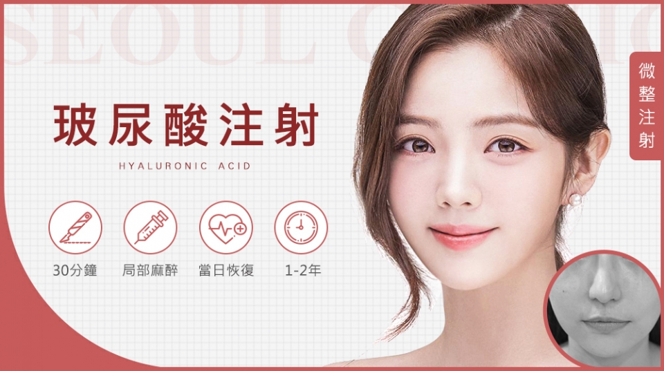 玻尿酸具有高黏彈性及保水性的功效,注入於真皮深層區,可增加真皮層體積、撐起凹陷,達到立即性的填平、塑型成效;注入於真皮淺層區,玻尿酸可與肌膚中水分子結合 ,使肌膚鎖水力提高,達到長效保濕及撫平細紋等作用。