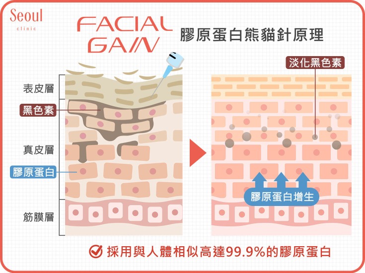 膠原蛋白熊貓針(双美膚力原)採用世界先進的天然膠原純化和交聯技術,其生物特性與人體膠原蛋白基本相同,達到99.9%,在使用上有高度的安全性。注射進去的第I型atelocollagen會迅速起到支撐作用,而植入部位的結締組織細胞將進入膠原蛋白網狀結構中,逐漸同化成與人體組織類似的結構,並刺激纖維母細胞產生自身的膠原蛋白,而植入的膠原蛋白經降解後產生的胺基酸,除了可以提供肌膚養分,更能有效降低黑色素產生並淡化黑色素。