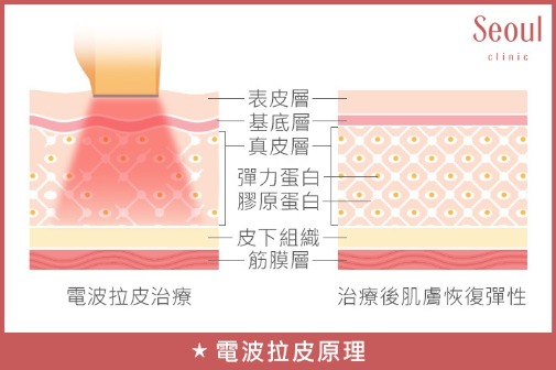 電波拉皮屬於非侵入性治療,其原理是利用每秒振動約600萬赫茲(6MHz)的無線高頻電波,容積式的加熱效應,治療溫度達55℃~75℃,在肌膚表層至深層產生熱能量,直導真皮層及皮下組織,最深可達4.3mm。