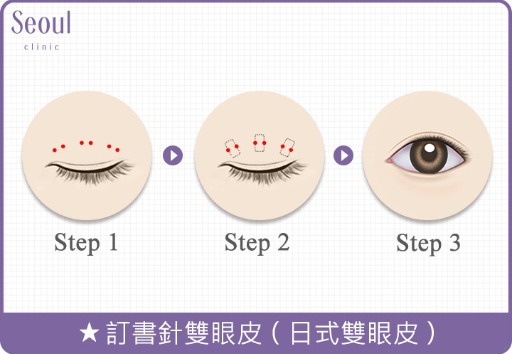 「訂書針雙眼皮手術」又稱日式雙眼皮,是利用日本引進的特殊器械,準確地將皮下眼瞼板與眼皮夾在一起,就像訂書針一樣在眼皮上釘上兩個縫合點,再搭配「口字型」的縫法,逐點以縫線縫合固定。