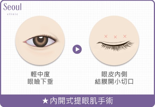 內開式提眼肌手術適合輕、中度提眼肌無力者,因其切口在上眼瞼內側,所以外觀近無疤痕恢復期短、術後無須拆線,但此術式僅拉提提眼肌高度,術後無雙眼皮效果,也無法處理贅皮和多餘脂肪的問題。