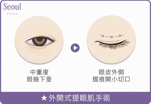 『外開式提眼肌手術』從雙眼皮摺痕切口進入,將鬆弛的提眼肌打摺重疊或部分切除,以提高眼瞼高度,解決眼皮下垂的問題。此術式會合併割雙眼皮手術施作,將提眼肌手術切口隱藏在雙眼皮摺痕當中