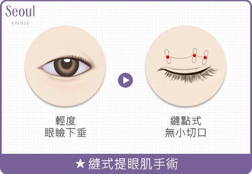 「縫式提眼肌手術」以特殊縫線將眼皮縫到提眼肌筋膜和眼瞼板處,,穿入再回穿出眼皮,進而將眼瞼肌筋膜縫緊,達到筋膜矯正的效果,通常會與縫雙眼皮手術一併施作,使用一樣的縫合點,無另外的切口